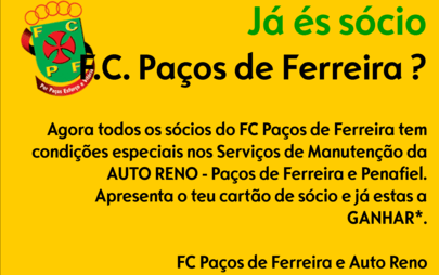 Condições Especiais para sócios do FC Paços de Ferreira, que apresentem cartão de sócio com as quotas devidamente regularizadas.