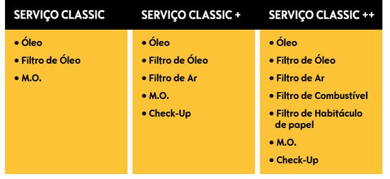 - SERVIÇO CLASSIC ++: Óleo + Filtro de Óleo + Filtro de Ar + Filtro de Combustível + Filtro de Habitáculo de papel + Mão-de-Obra + Check-Up